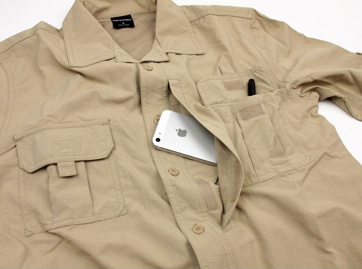 ナイロン100%のリップストップ生地を採用。背中面にベンチレーションを設置、通気性が良く、サラサラとした肌触りがとても気持ちが良いです。袖のロールアップが出来るよう、肘部より少し上にボタンが設置されています。両胸にポケットがある他、左胸にサイドアクセスポケット、右裾部にジッパーポケットが付属しています。