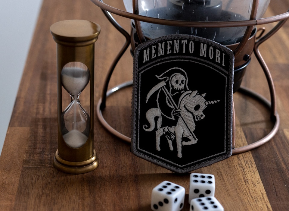 - ユニコーンに乗った死神をモチーフにしたPVCモラールパッチです。「MEMENTO MORI メメント・モリ=死を忘れるな(ラテン語)」という古代よりの警句にリンクさせたデザインです。また、刺繍に蓄光糸(GID スレッド)を使用しており、暗闇でモチーフが発光し浮かび上がります。