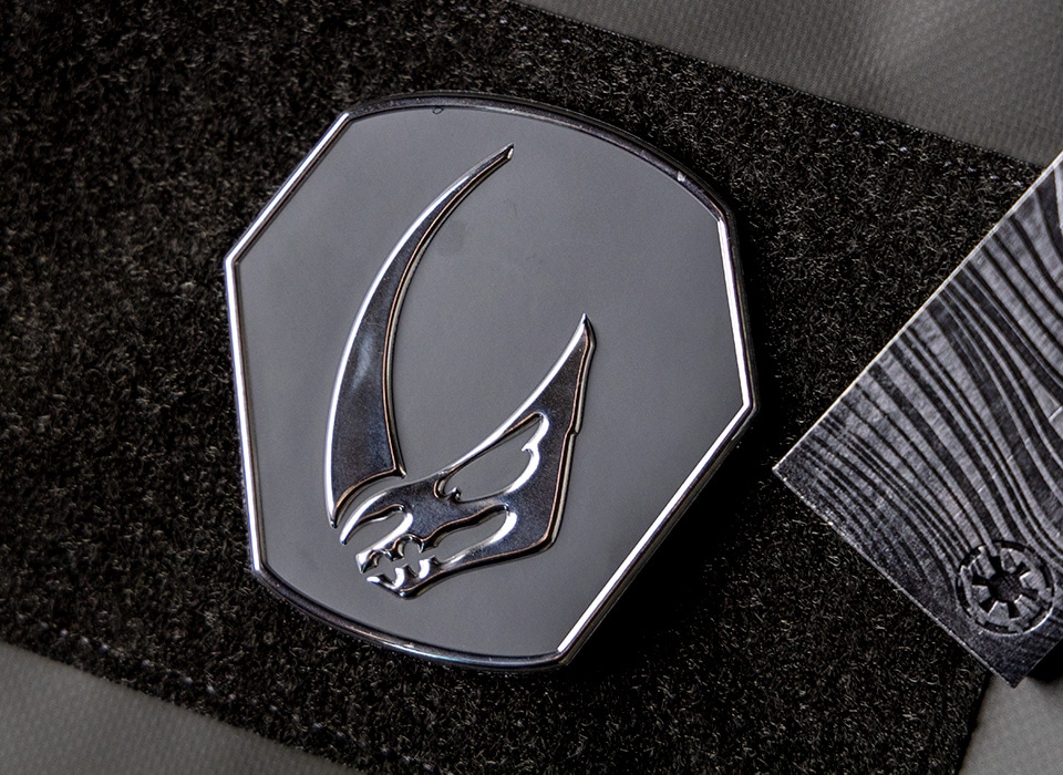 - 某SF大作のスピンオフドラマより。主人公にまつわるシンボルとして登場するモチーフがPVC製モラールパッチに。サイのように見えるコレは「マッドホーン」と呼ばれる一本角の怪物。主人公が着用するアーマーの肩甲には、このシンボルが施されています。光沢のあるシルバーコーティングにて表現されたデザインとなっており、輝くベスカーアーマーを想わせます。