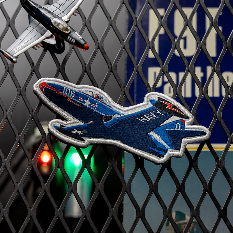 - 50年代ごろに米海軍にて運用されていた艦上戦闘機「F9F パンサー」をモチーフにした刺繍モラールパッチです。「F9F パンサー」は戦闘機としての性能こそ同世代のモノに比べると劣るものの、優れた戦果を挙げた戦闘機としてしられています。