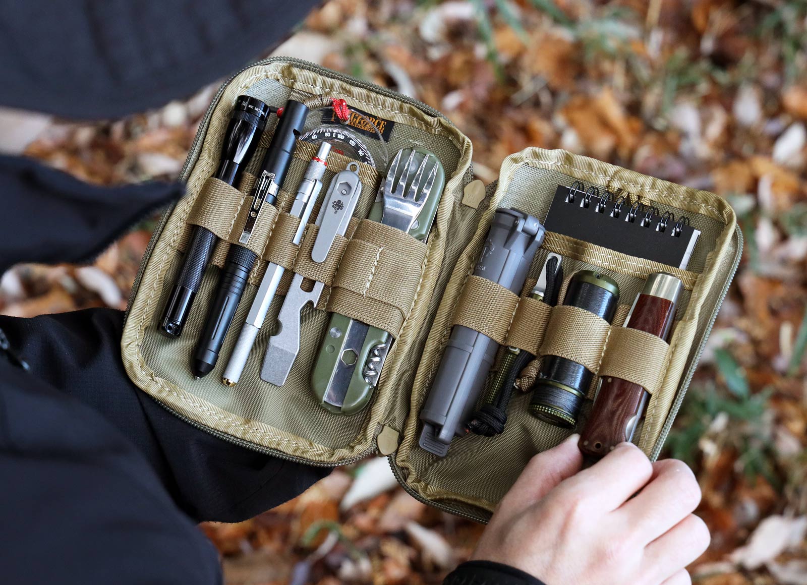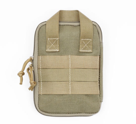 - ツールや、フラッシュライト、キャンプギアなどをまとめて収納することができるEDCポーチです。内部に縫い付けられたエラスティックバンドによってツールの類を固定・整頓することが可能。 外部にはメッシュポケット、背面にはMOLLEシステム対応のウェビングパネルを備えています。 上部のハンドルストラップによってポケットやバックからの取り出しもスムーズにおこなえます。
