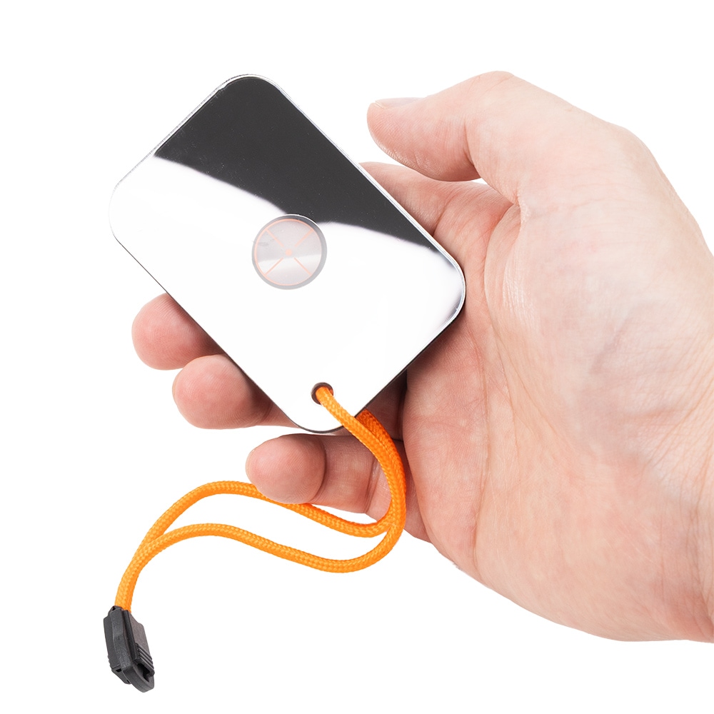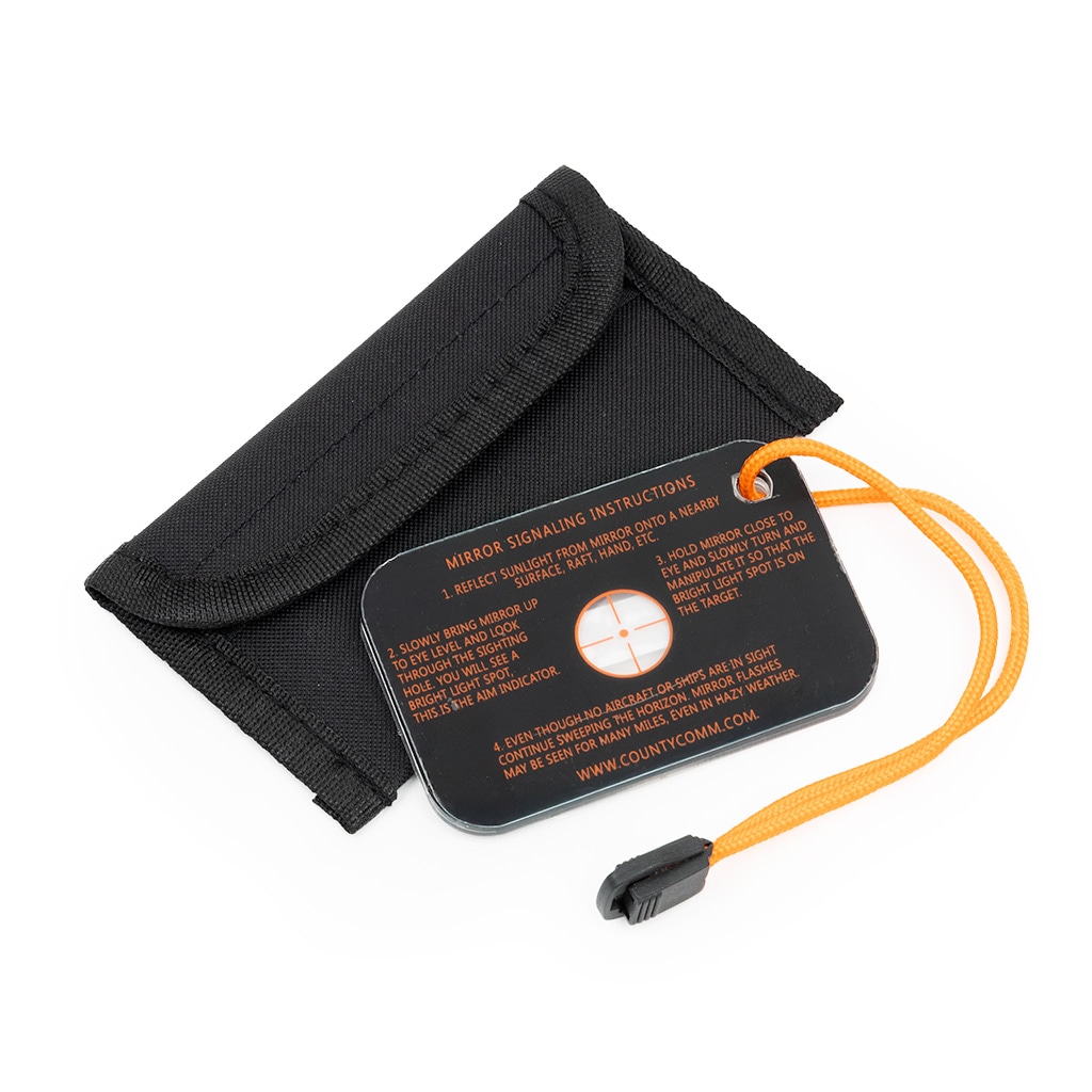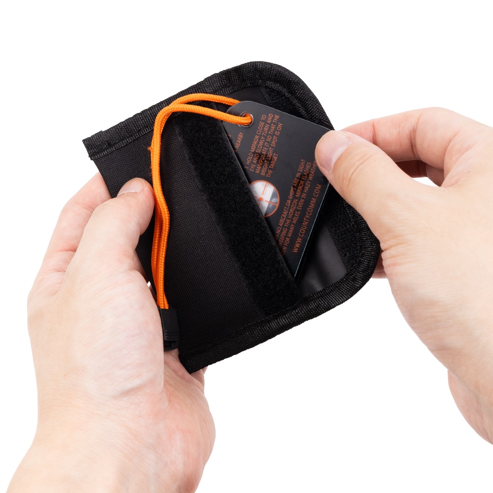 本体はガラスではなく、軽量かつ割れにくいコンポジット素材を採用。重量はわずか34g、サイズは7.6cm × 5cmと手のひらに収まるコンパクトさで、携帯性にも優れています。 さらに、ランヤードと耐久性のあるナイロンキャリーポーチが付属。防災やサバイバルアイテムとして、いざというときに備えておきたい実用的なシグナルミラーです。