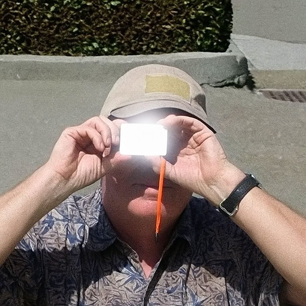 - 1. ミラーに太陽光を反射させ、まずは手や地面、近くの物に光を当てて位置を確認します。
