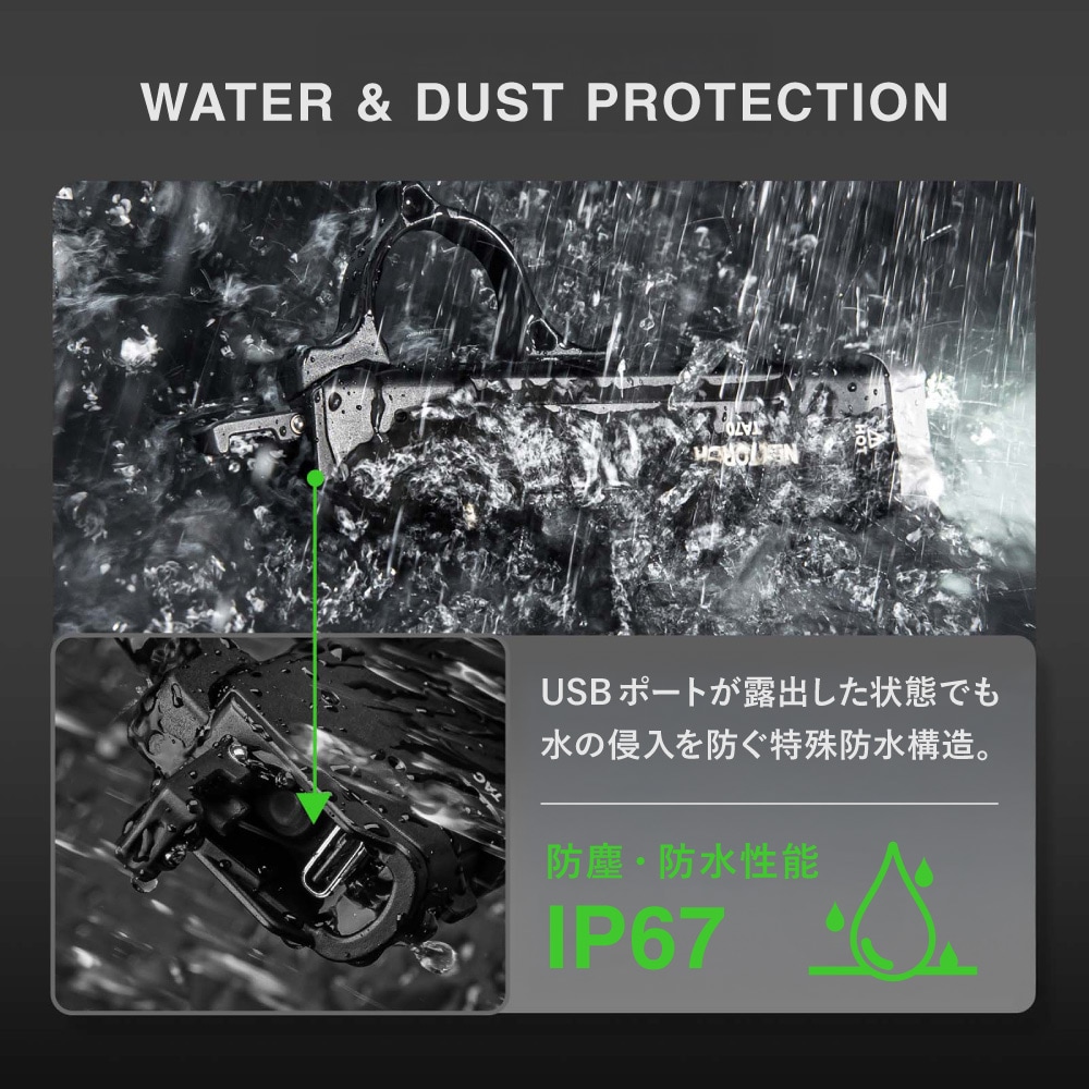 IP67に準拠した防塵防水性能を持っており、過酷な環境下でも使用可能。独自の二重構造によって充電用のUSBポートが露出した状態でも、防塵防水性能が損なわれることはありません。